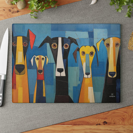 Glass Cutting Board Featuring The Original Dog Pack Design