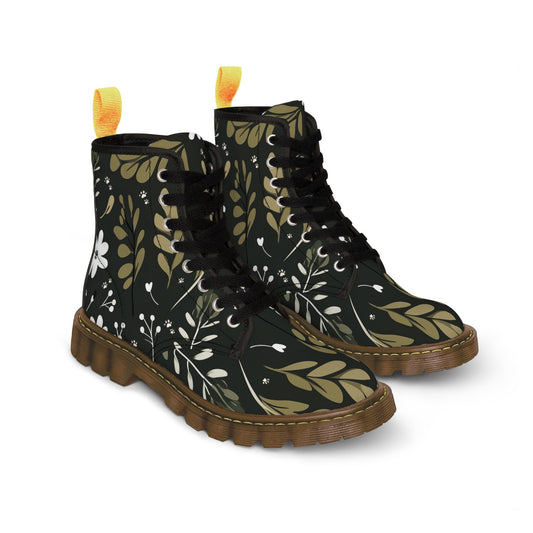 Women's Canvas Boots Featuring a Green Boho Flower and Paw Print Design