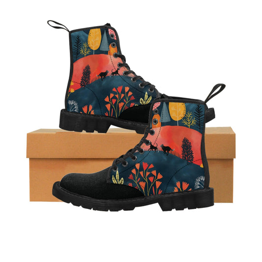 Women's Canvas Boots Featuring a Dark Blue Boho Flower and Paw Print Design