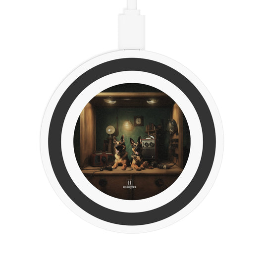 Quake Wireless 5W Charging Pad featuring a vintage German Shepherd dog design [2.7"w x 0.33"h]